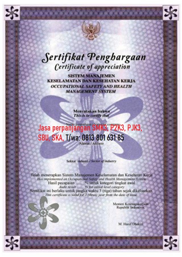 Jasa perpanjangan sertifikat SMK3 I 0813 801 631 85 Wa Kemenakertrans RI saja melainkan untuk Membuat baru sekalipun kami siap membantu anda. satu lagi proses Jasa Perpanjangan Sertifikasi SMK3 I 0813 801 631 85 WA akan memakan waktu maks 4 minggu dari Audit di lakukan (Keluar surat SKA KEMENAKERTRANS RI). Sebelum audit visit di lakukan oleh auditor maka Konsultan SMK3 bersama-sama dengan Klien akan melengkapi dokumen terkait Audit kedepannya misalnya perpanjangan susunan struktur P2K3 dan lain-lain. hubungi kami sekarang, Jasa LPJK Terpercaya Cepat dan murah untuk Perusahaan Indonesia.